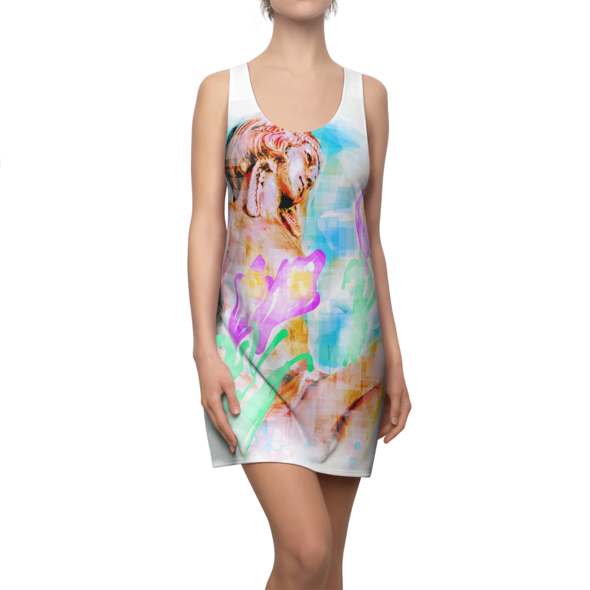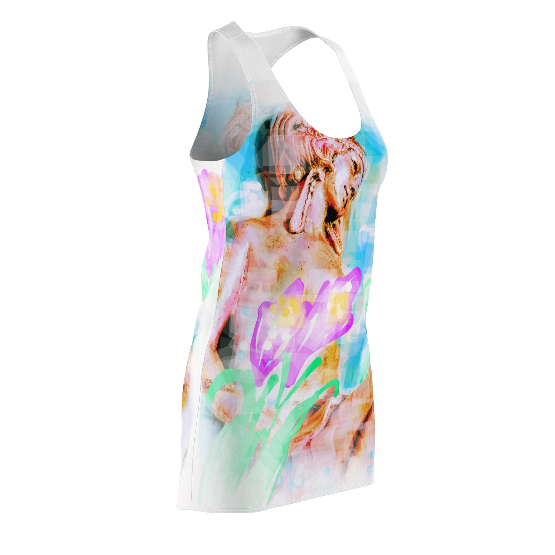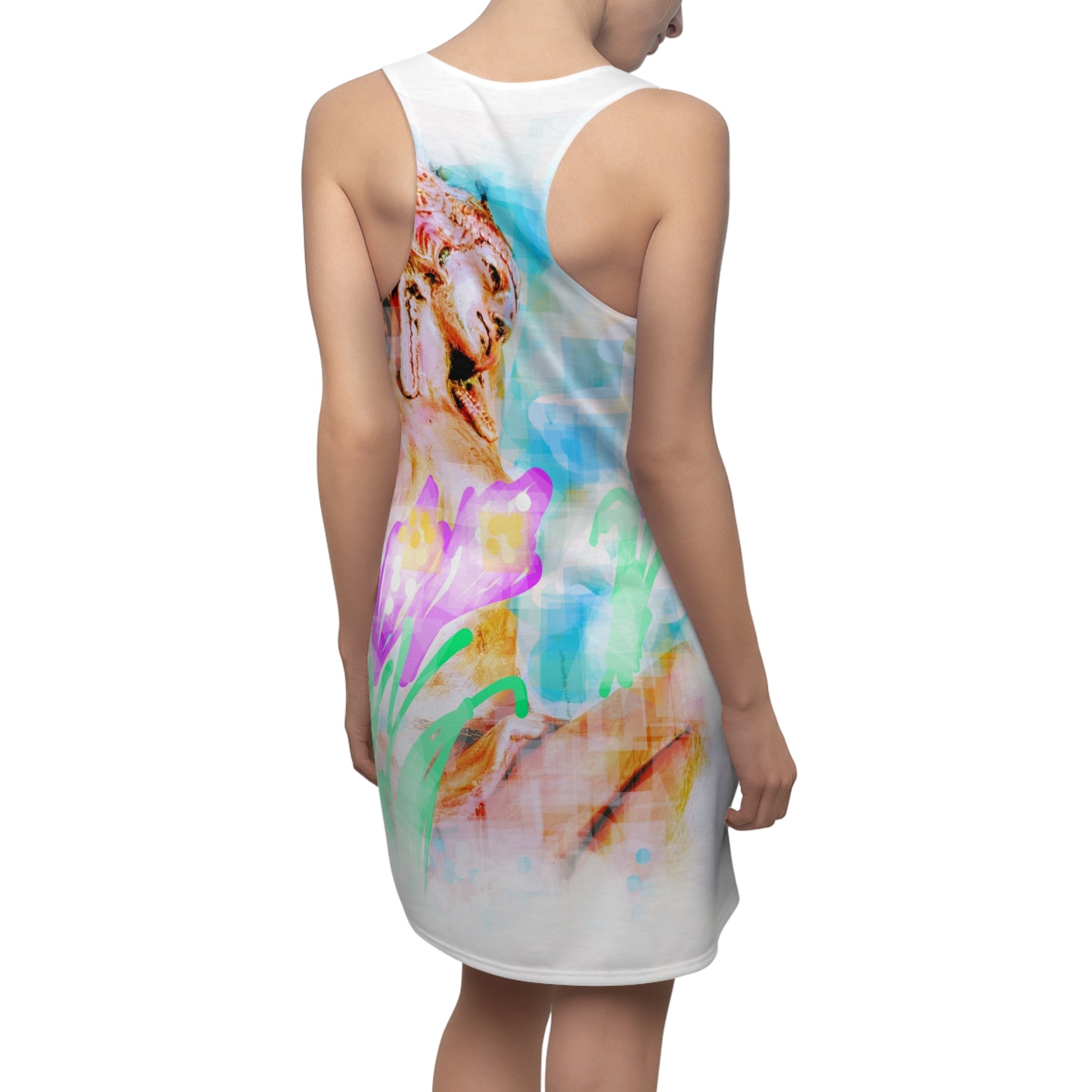 A feminine and stylish, yet really comfortable dress. This high quality AOP racerback dress is appealing from every angle. Inspired by the freedom of creativity, it will instantly become everyone's alltime favorite.